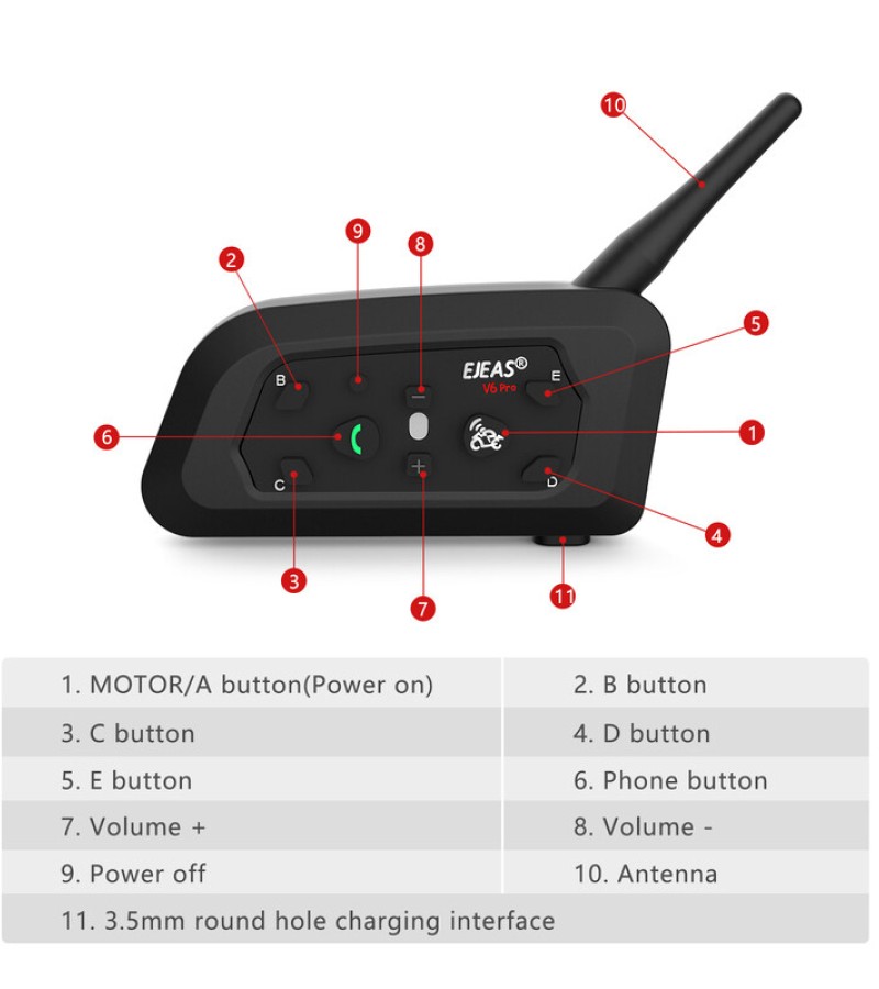 The intercom supports six riders using device, two riders talk at the same time, one main device can pair with 5 sub-devices, the main device can choose one to talk from A/B/C/D/E sub-devices.