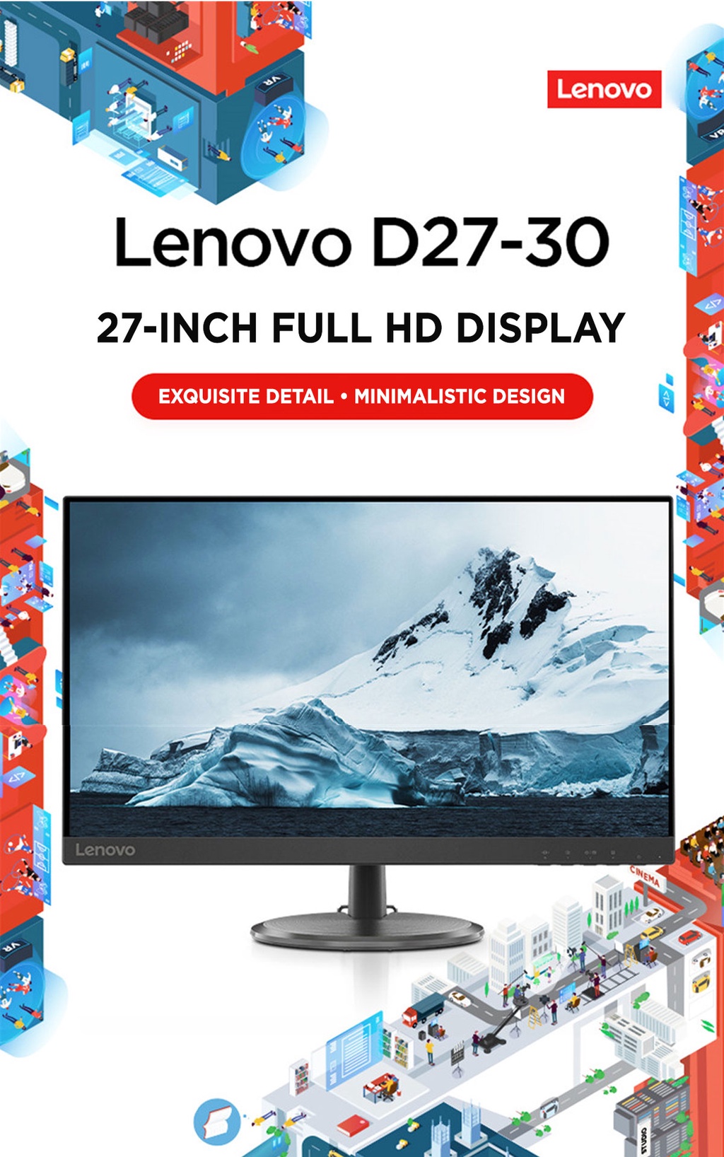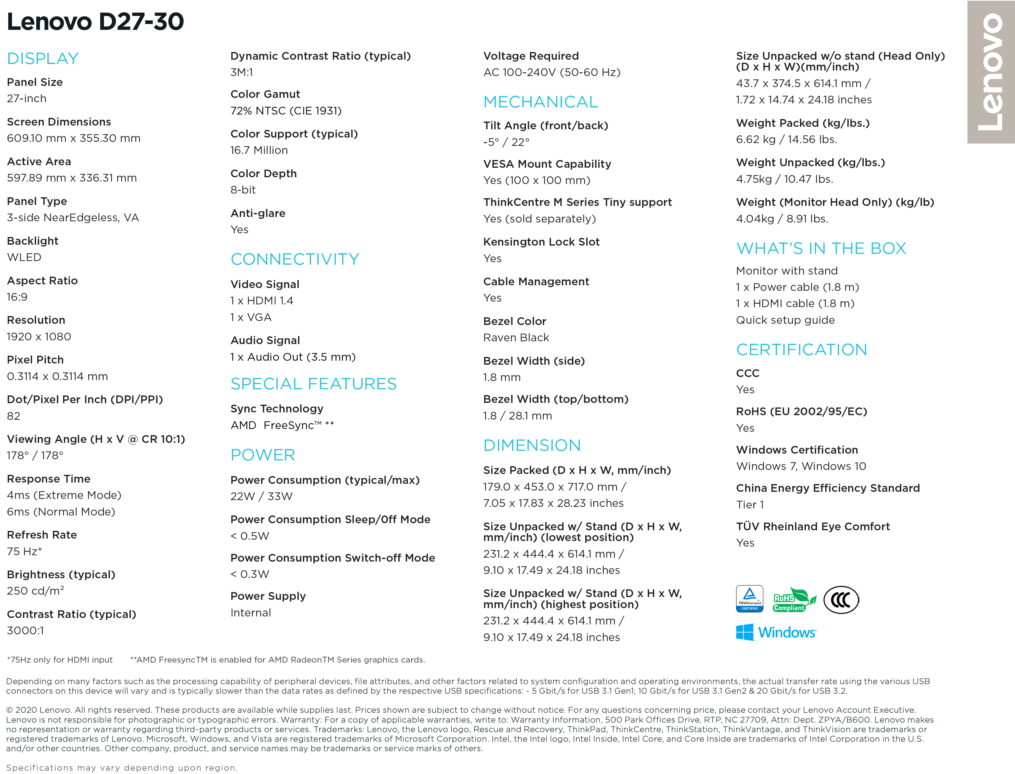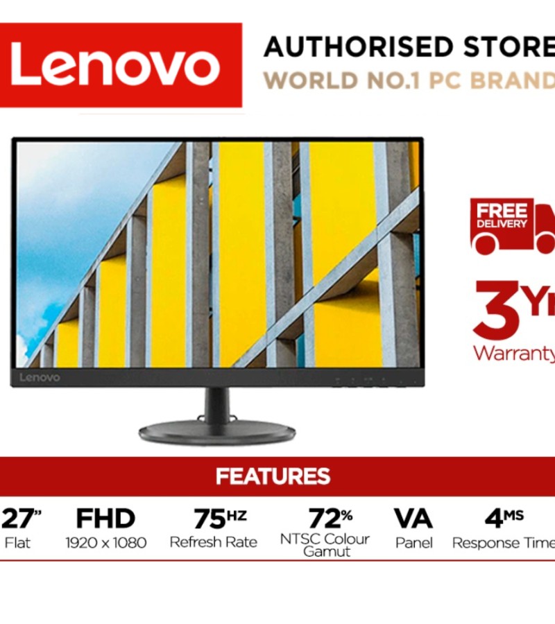 [最佳卖家]联想D27-30 27英寸FHD 1920x1080显示器(66B8KAC6MY)250尼特|72%NTSC 82 dpi |4ms响应率|HDMI VGA多输入|HDMI电缆含|3Y保修