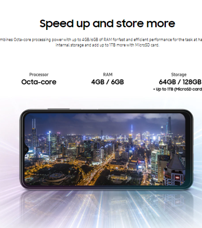 - NETWORKTechnologyGSM / HSPA / LTELAUNCHAnnounced2022, March 04StatusAvailable. Released 2022, March 23BODYDimensions165.1 x 76.4 x 8.8 mm (6.5 x 3.01 x 0.35 in)Weight195 g (6.88 oz)BuildGlass front (Gorilla Glass 5), plastic frame, plastic backSIMSingle SIM (Nano-SIM) or Dual SIM (Nano-SIM, dual stand-by)DISPLAYTypePLS LCDSize6.6 inches, 104.9 cm2 (~83.2% screen-to-body ratio)Resolution1080 x 2408 pixels, 20:9 ratio (~400 ppi density)ProtectionCorning Gorilla Glass 5PLATFORMOSAndroid 12, One UI 4.1ChipsetExynos 850 (8nm)CPUOcta-core (4x2.0 GHz Cortex-A55 & 4x2.0 GHz Cortex-A55)GPUMali-G52MEMORYCard slotmicroSDXC (dedicated slot)Internal32GB 3GB RAM, 64GB 4GB RAM, 128GB 4GB RAM, 128GB 6GB RAM
