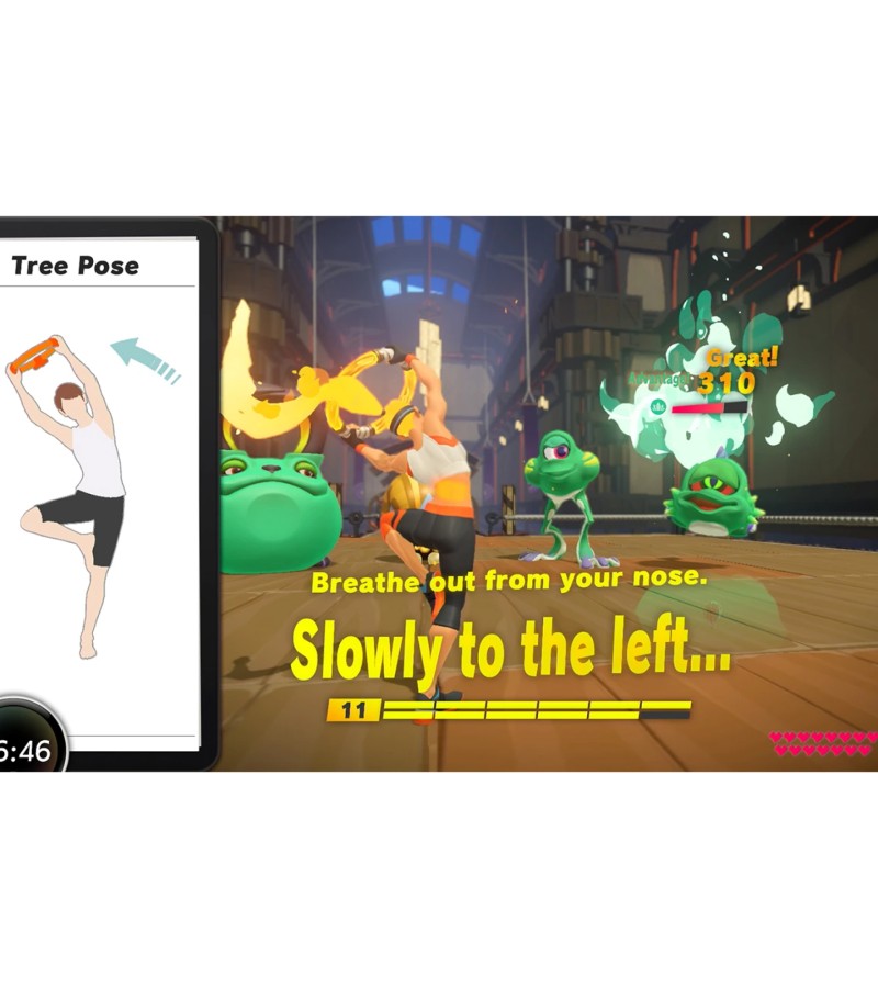 Traverse grass-swept plains by jogging in place, attack enemies with overhead shoulder presses, and refill your health meter by striking some yoga poses. Two new accessories, the Ring-Con™ and Leg Strap, measure your real-world actions and help turn them into in-game movements. With additional minigames and customizable workout routines, Ring Fit Adventure is great escape for players of all skill levels and schedules.In Adventure mode, defeat enemies with attacks based on real-world exercises as you traverse more than 100 levels in over 20 worlds. As you work through each level (and possibly work up a sweat), you’ll earn experience points. Between fights, you may encounter some unusual methods of transportation such as squat-powered launch pads. Then, pass around the Ring-Con and leg strap accessories and select from a few minigames: break boxes with gusts of air, craft pottery using squats, and more.